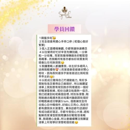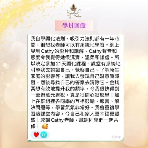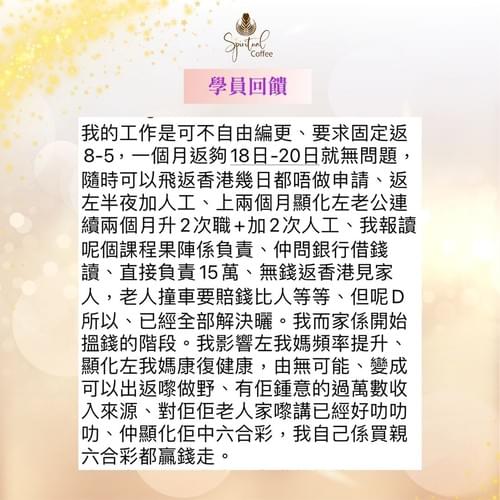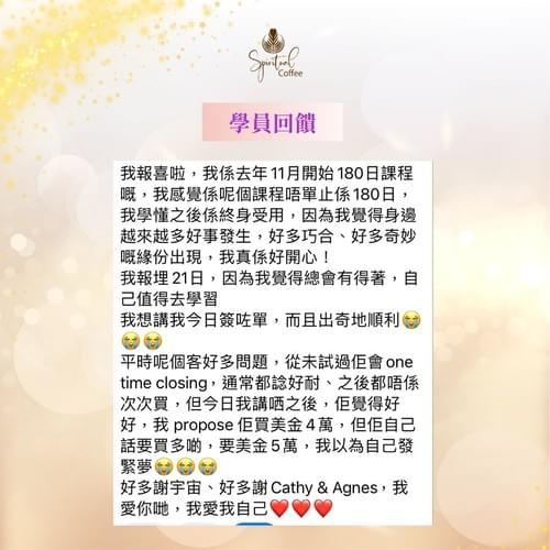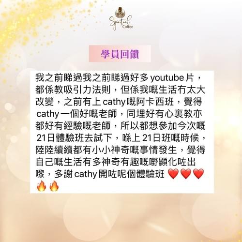 課程以外,更配合一節單對單個人諮詢 (Cathy指定導師負責),你能從諮詢中得知一直影響著自己夢想成真的限制性信念,諮詢時間為2小時,所有訊息皆是屬於你個人的專屬訊息,過往不少參與諮詢的學員皆表示, 縱使之前已在其他地方做過不少諮詢,仍對我們諮詢的準成度和細緻度感到驚訝,全因我對團隊導師要求很嚴格,確保每一個參加者,都能在諮詢中得到巨大價值。