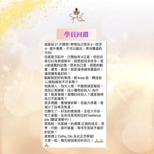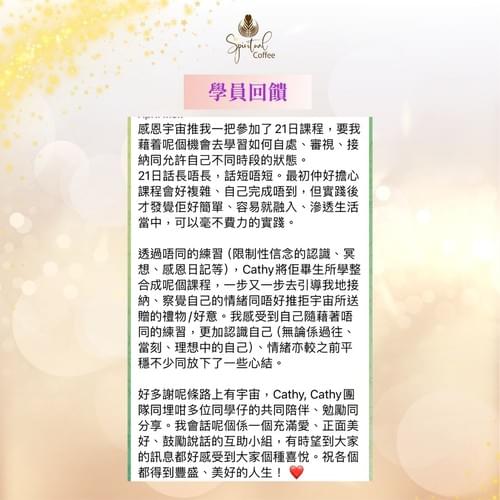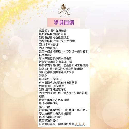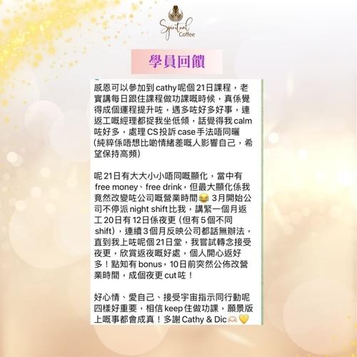 為了協助你盡快擺脫纏繞你多時的困難 (畢竟人生真的沒有太多可以浪費的時間),獲得你本該擁有的理想金錢/ 感情關係,在這個21天顯化豐盛理想人生課程中,我會每天給你一些小練習/功課,輕鬆遂步邁向你想要的理想生活。配合一節單對單個人諮詢,你更能得知一直影響著自己進步的限制性信念,繼而把他們逐一擊破!